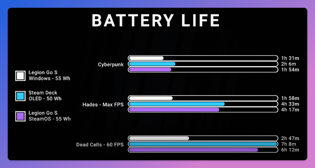 In games like Dead Cells, the battery life under Steamos doubles over six hours. Even with graphically demanding titles such as cyberpunk 2077, the battery lasts 23 minutes longer under Steamos than under Windows. Steamos also shows advantages when it comes to general use: the fans are less common and the standby mode works more reliably than under Windows. This contributes to the longer battery life.