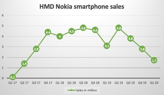 CounterPoint Research market researchers report, according to Nokiamob, that HMD Global sales of smartphones declined sharply again in the first quarter of the year. Compared to the same period in the previous year, the decline was 45.2 percent, although the first quarter is traditionally the lowest point of the year in terms of smartphone sales.