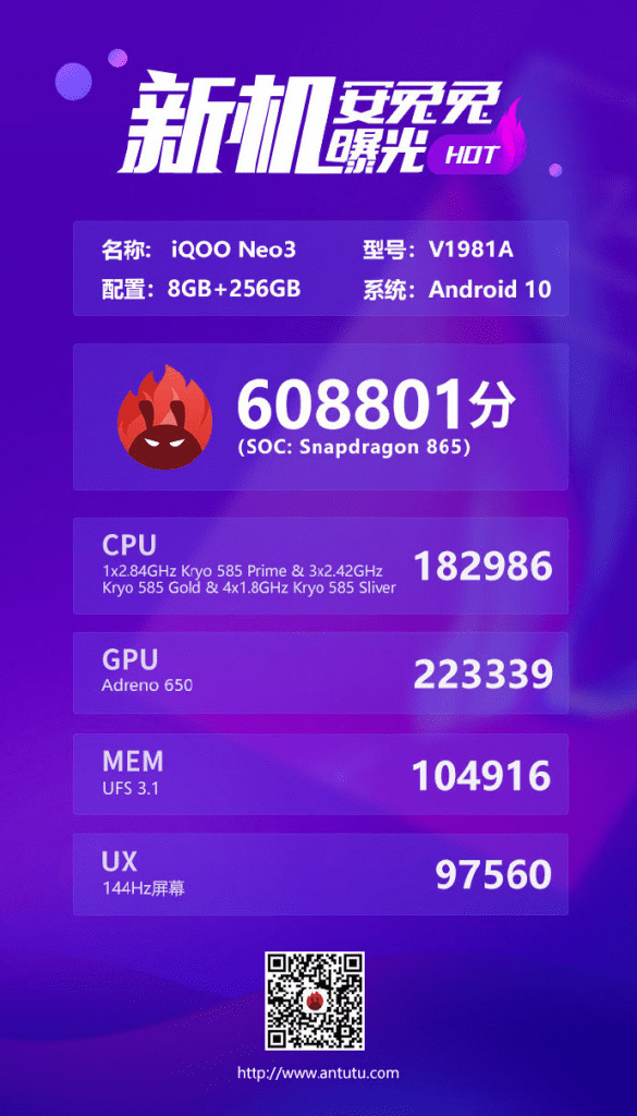 iQOO Neo 3 Antutu Benchmark Score Reached 608801