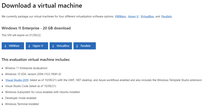 The images are immediately ready for use and can be integrated into a virtual machine immediately. In addition to VMWare and VirtualBox, Hyper-V and Parallels are also supported. In addition to the Enterprise Edition of Windows 11, the copies contain the Windows 10 SDK, Visual Studio 2019, and the Windows Subsystem for Linux. In addition, the developer mode has been activated so that developers can use the images to test their programs.